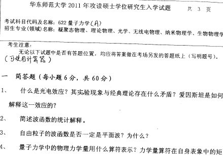 聚英考研网收集整理了2011年华东师范大学622量子力学A考研真题,部分内容如下:
