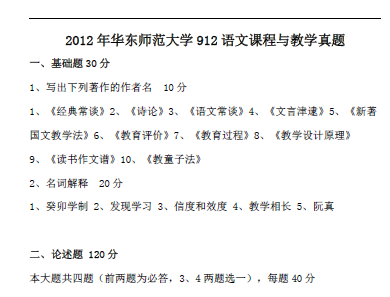 聚英考研网收集整理了2012年华东师范大学912语文课程与教学考研真题,部分内容如下: