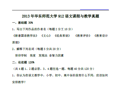 聚英考研网收集整理了2013年华东师范大学912语文课程与教学考研真题,部分内容如下: