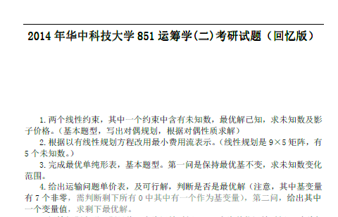 2014年华中科技大学851运筹学(二)考研试题(回忆版)