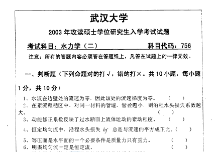 武汉大学武汉大学756水力学(二)2003年考研真题