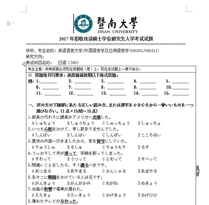 一、 次の文の下線部にあたる正しい読み方、または漢字をA・B・C・Dから一番いいものを一つ 選びなさい。(1点×15問=15点) 1.部長の代わりに課長がアメリカへ出張した。 Aしゅちょう Bしゅうちょう Cしゅっちょう Dしゅっちょ 2.いつも心配をかけて、申し訳ありませんでした。 Aしんばい Bしんはい Cしんぱい Dこころはい 3.夏休み外国へ行きましたから、家を留守にしていた。 Aりゅうしゅ Bるしゅ Cりゅうもり Dるす 4.うっかりして手が滑って、茶碗を割ってしまった。 Aすわって Bうつって Cとおって Dすべって 5.間違いことをしたら、すぐ謝るべきです。 Aあつまる Bあやまる Cかんしゃる Dあまやる 6.あそこに眼鏡をかけている人は兄です。 Aがんきょう Bがんがかみ Cめがね Dめきょう 7.台風の影響で電車が遅れた。 Aええきょ Bえいきょう Cかげきょう Dかげひび 8.壊れたテレビがなおった。 A治った B直った C置った D修った 9.お盆休みにこきょうに帰りたい。 A故郷 B古郷 C古里 D故里 10.この仕事はしろうとの私でもできる。 A玄人 B四人 C白人 D素人 11.私は日本の歌舞伎にきょうみがない。 A趣味 B関心 C興味 D興趣 12.連絡先がきまったら、ぜひ教えてください。 A極まった B定まった C決まった D期まった 13.この機械の使い方について分かりやすく、ていねいに説明してください。 A定寧 B丁寧 C亭寧 D叮嚀 14.一生懸命登ったあげく、やっと山のちょうじょうに着きました。 A長城 B頂上 C超上 D頂場 15.このあたりはやちんが高い。 A家賃 B部屋代 C屋賃 D屋代