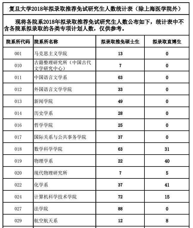 复旦大学2018年推免生拟阿取人数统计表(除上海医学院外)