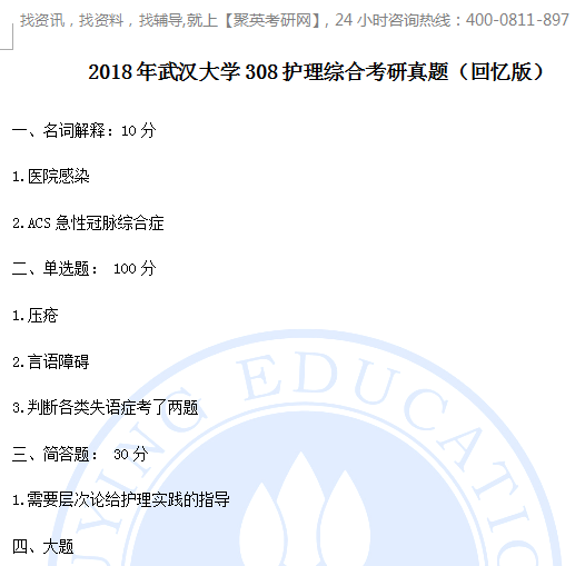 附件内容包含:2018年武汉大学308护理综合考研真题(回忆版).pdf