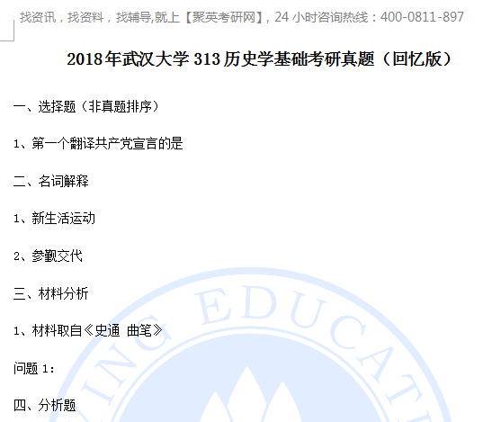 附件内容包含:2018年武汉大学313历史学基础考研真题(回忆版).pdf