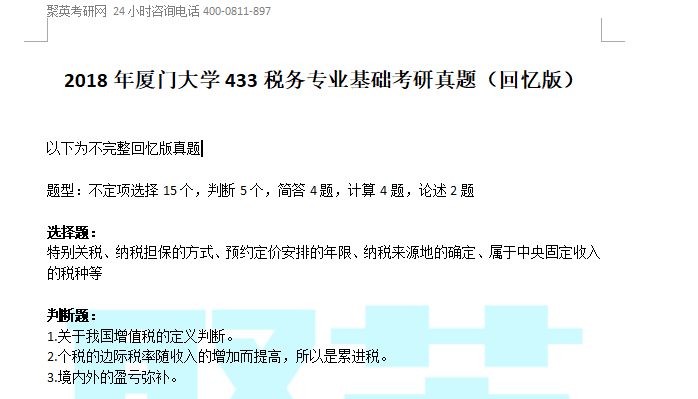 聚英考研网整理提供2018年厦门大学433税务专业基础考研真题(回忆版),部分内容如下: