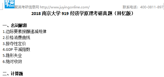 聚英南京大学考研网小编整理了2018南京大学919经济学原理考研真题(回忆版),部分内容如下: