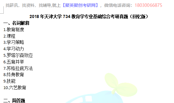 聚英天津大学考研网小编整理了2018年天津大学734教育学专业基础综合考研真题(回忆版),部分内容如下: