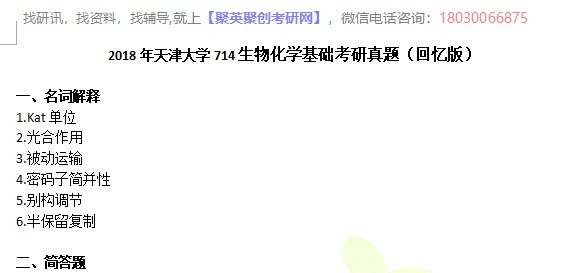 聚英天津大学考研网小编整理了2018年天津大学714生物化学基础考研真题(回忆版),部分内容如下: