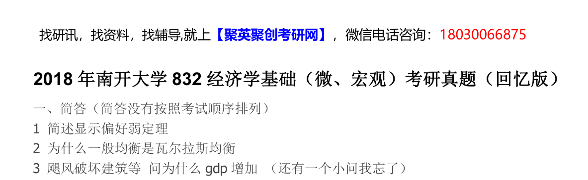 聚英南开大学考研网小编整理了2018年南开大学832经济学基础(微、宏观)考研真题(回忆版),部分内容如下: