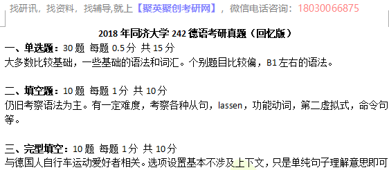 聚英同济大学考研网整理了2018年同济大学242德语考研真题(回忆版),部分内容如下: