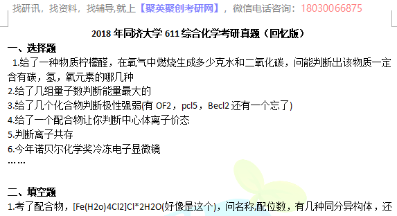 聚英同济大学考研网整理了2018年同济大学611综合化学考研真题(回忆版),部分内容如下: