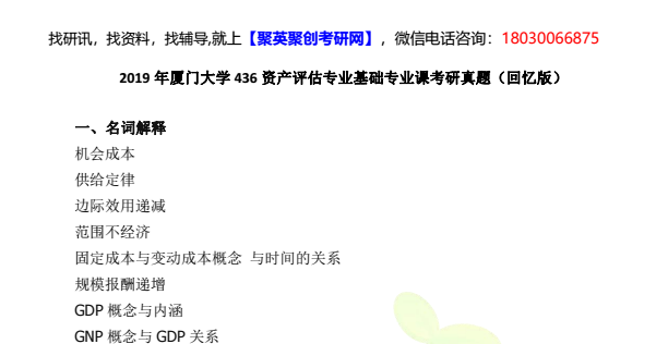 聚英厦门大学考研网整理提供2019年厦门大学436资产评估专业基础专业课考研真题(回忆版),部分内容如下: