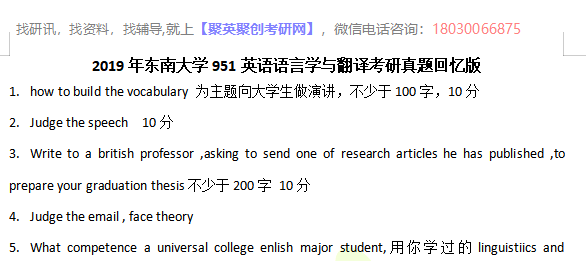 聚英东南大学考研网整理了2019年东南大学951英语语言学与翻译考研真题回忆版,部分内容如下:
