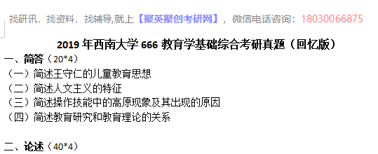 聚英西南大学考研网整理了2019年西南大学666教育学基础综合考研真题(回忆版),部分内容如下:完整内容请下载附件