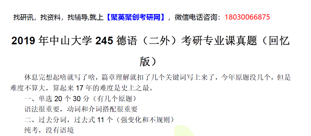 聚英中山大学考研网整理了2019年中山大学245德语(二外)考研专业课真题(回忆版),部分内容如下: