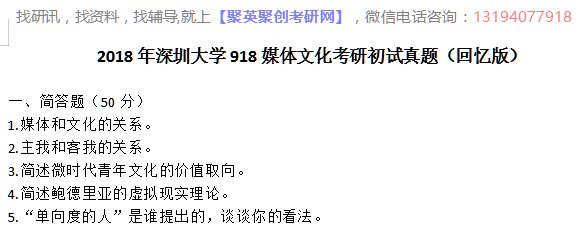 聚英深圳大学考研网整理了2018年深圳大学918媒体文化考研初试真题(回忆版) ,部分内容如下: