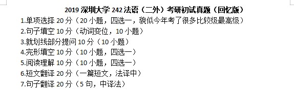 附件内容包含:2019深圳大学242法语(二外)考研初试真题(回忆版).pdf