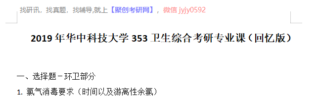 考研学习中,专业课占的分值较大。报考院校专业的考研专业课真题是专业课复习中必不可少的资料。聚创华中科技大学考研网为大家整理了2019年华中科技大学353卫生综合考研专业课(回忆版),并且可以提供华中科技大学考研专业课辅导,希望更多考生能够在专业课上赢得高分,升入理想的院校。