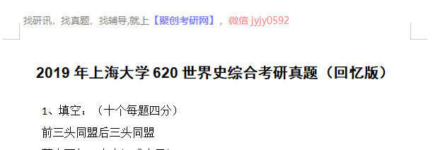 考研学习中,专业课占的分值较大。报考院校专业的考研专业课真题是专业课复习中必不可少的资料。聚创上海大学考研网为大家整理了2019年上海大学620世界史综合考研真题(回忆版),并且可以提供上海大学考研专业课辅导,希望更多考生能够在专业课上赢得高分,升入理想的院校。