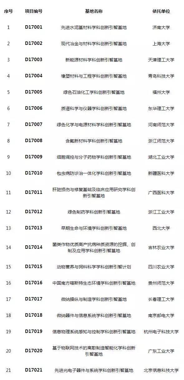 继 2016年后,2017年共有21所地方高校入选111计划,入选高校基本都是实力强劲的省属重点大学,包括济南大学、上海大学、天津理工大学、青岛科技大学、福州大学、东华理工大学、河南师范大学、浙江师范大学、湖北工业大学、新疆医科大学、广西医科大学、浙江工业大学、西北大学、吉林农业大学、四川农业大学、贵州师范大学、长春理工大学、南京邮电大学、杭州电子科技大学、广东工业大学、北京信息科技大学等。 其中,上海大学、福州大学、浙江师范大学和浙江工业大学四所高校本次是第二次入选111计划。