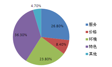 48.Emerging from the clearly depicted pie chart is the distribution of focusing factors of citizens in a city when choosing a restaurant in 2017, consisting of 4 parts, which are features, service, environment, price and other factors. Among them, the proportion of service, environment, price and other factors is 26.8%, 23.8%, 8.4% and 4.7% respectively. By contrast, the factor of focusing on features of the restaurant is in the lead, accounting for 36.3%.