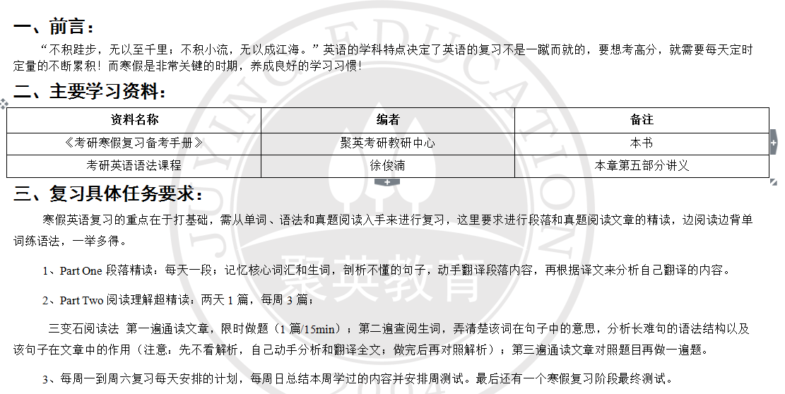 寒假备考指导内容包含:2019考研备考手册大纲、考研英语和数学的单元测试题及答案、考研数学和英语的免费视频直播教程,如下图: