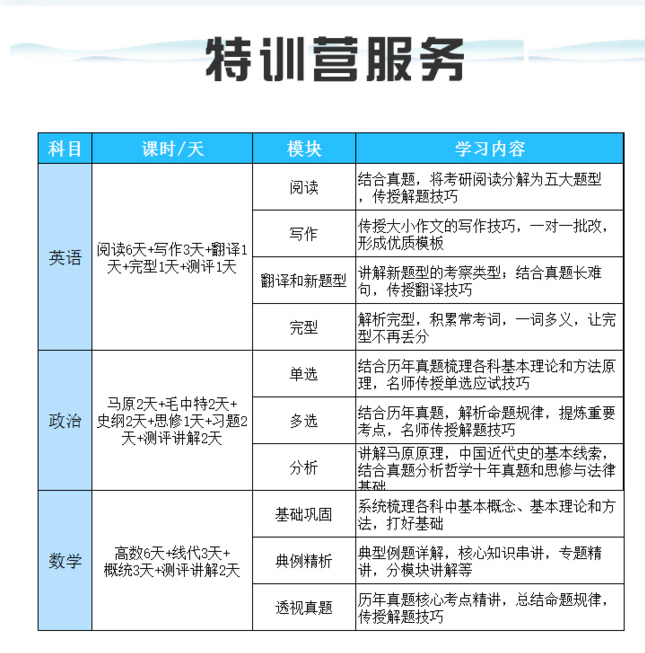 考研资料和考研信息就不用说了,集训营老师都会给你准备好的,第一手的考研资料和考研信息绝对不会错过。毕竟老师都是一届一届带过来的,考研经验丰富。