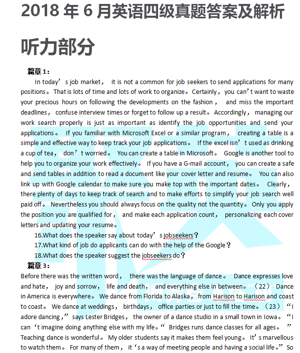 附件下载:2018年6月英语四级真题答案及解析(听力+翻译+阅读+完形填空)