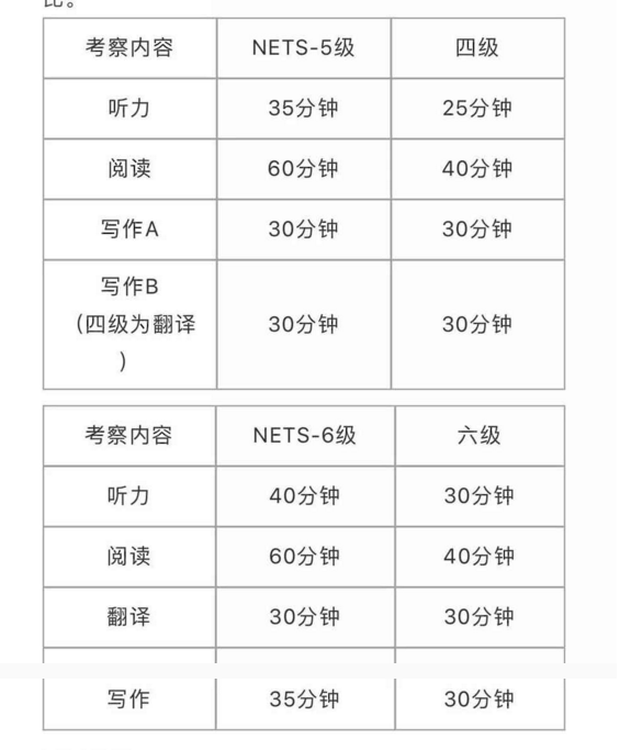 以下是NETS考试与四六级考察题型及考试时长对比。