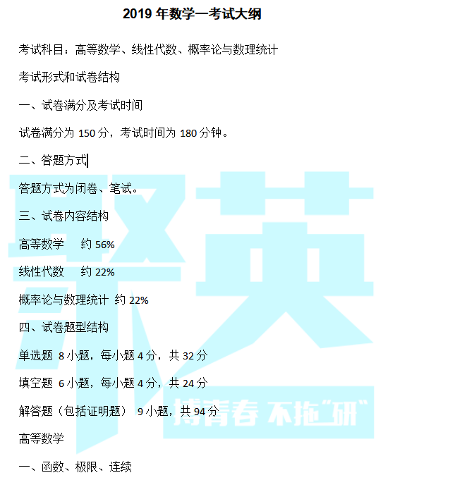 2019考研大纲数学一已发布,为方便大家备考,聚英考研网 整理如下: