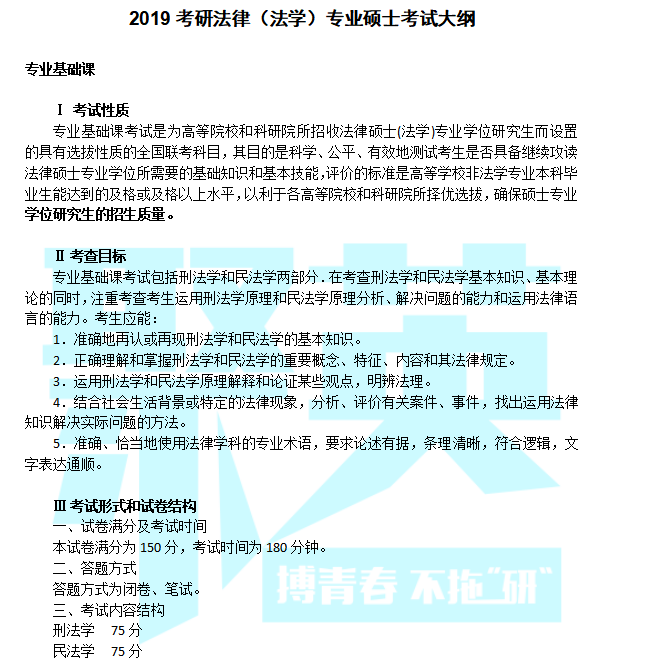 据悉,2019年全国硕士研究生招生考试法律硕士(法学)专业学位联考考试大纲已公布,聚英考研网为您整理内容如下: