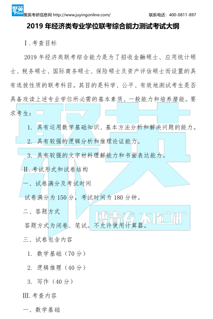 据悉,2019年经济类专业学位联考综合能力测试考试大纲已公布,聚英考研信息网小编为大家整理如下: