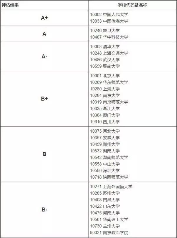 北京大学,华东师范大学,上海大学,南京大学,南京师范大学,浙江大学,厦门大学,四川大学的新闻传播学在此次评估中处于B+档。
