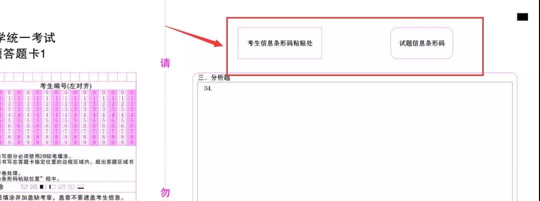 看到上图红框标出来的区域了吗,是考生信息条形码粘贴处和试题信息条形码粘贴处。“考生信息条形码”仅针对统考科目使用,由监考员分发给考生。另外,有两张答题卡的科目,就会有两个“考生信息条形码”,两张答题卡都需要贴。