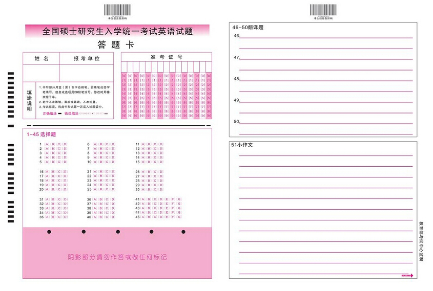 考研答题卡一般分为:个人信息区和答题区。