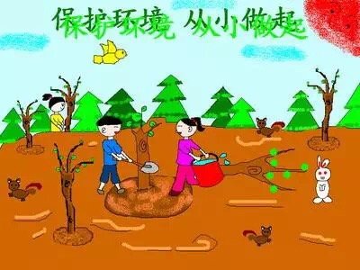 In the first picture, a boy and a girl are planting trees together, contributing their humble share to preserve the eco-system from an early age. And we see a green city without smog in the next picture, where high-rise buildings peek out from thick branches. These scenes are really encouraging.