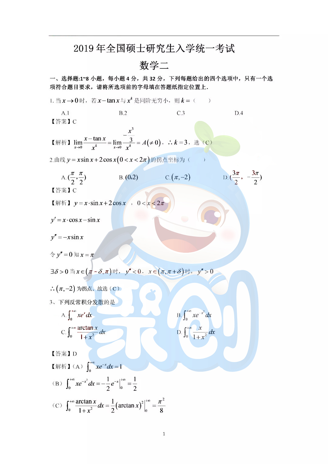 聚英聚创考研信息网小编在2019考研数学考试结束后,根据多位权威名师的解析,争分夺秒的整理发布2019年考研数学二真题及答案解析,以便帮助童靴们做好考后估分事宜。