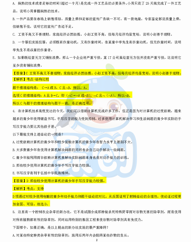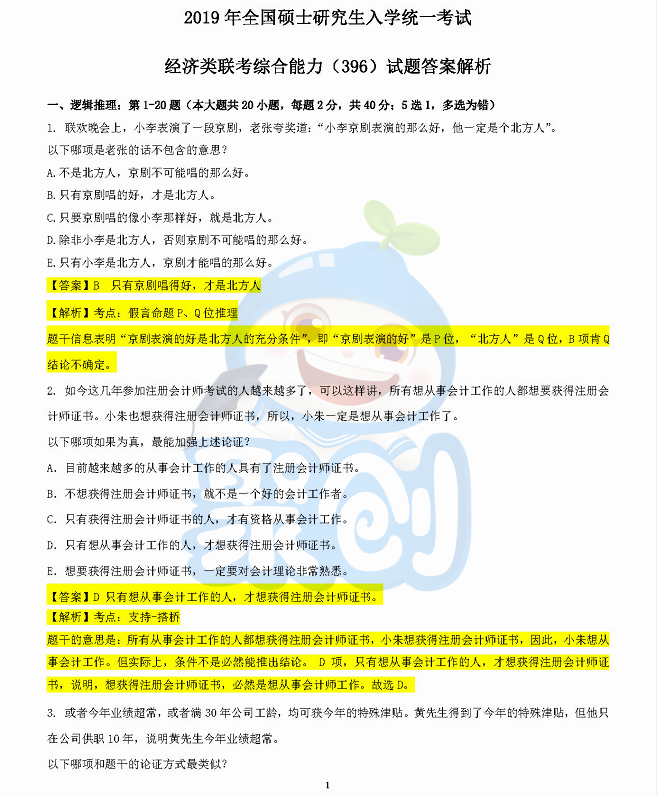 2019年全国研究生考试396经济类联考已结束,聚英厦门大学考研网小编为大家整理了2019年全国研究生考试396经济类联考试卷部分真题及答案解析,希望对大家有帮助!由于试卷内容分为逻辑推理、数学基础和写作三个部分,所以文章内容也分为三个部分发布。以下是第一部分逻辑推理: