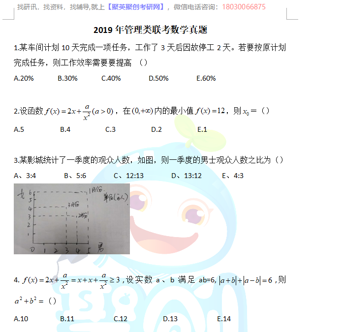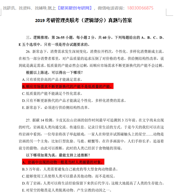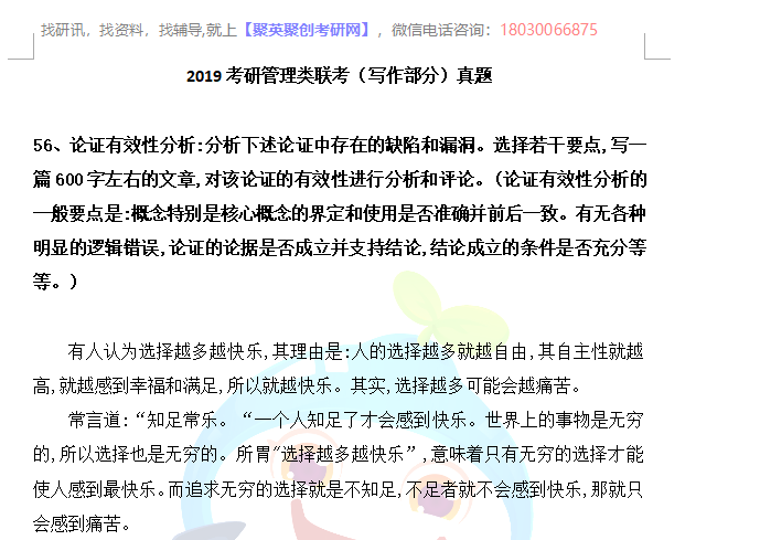 以上是聚创考研网为考生整理的"2019年考研199管理类联考综合真题+答案解析"的相关考研信息,希望对大家考研备考有所帮助! 备考过程中如有疑问,也可以添加老师微信H17720740258进行咨询。