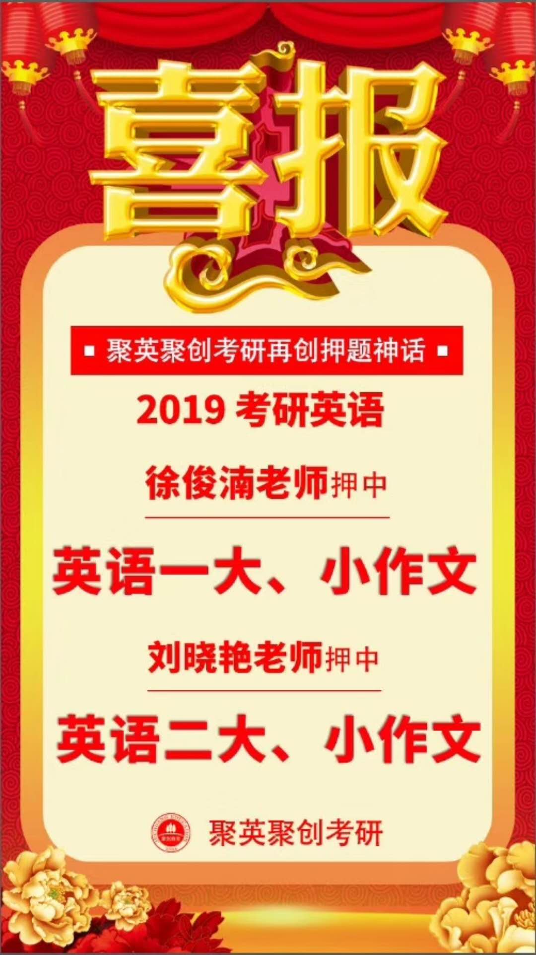 在刚结束的2019考研英语考试之中,聚英聚创考研再次传来捷报,继上午押中2019考研考研政治四道大题之后,来自聚创江西、广东分校的刘晓艳和徐浚楠老师双双押中考研英语大小作文!可喜可贺!