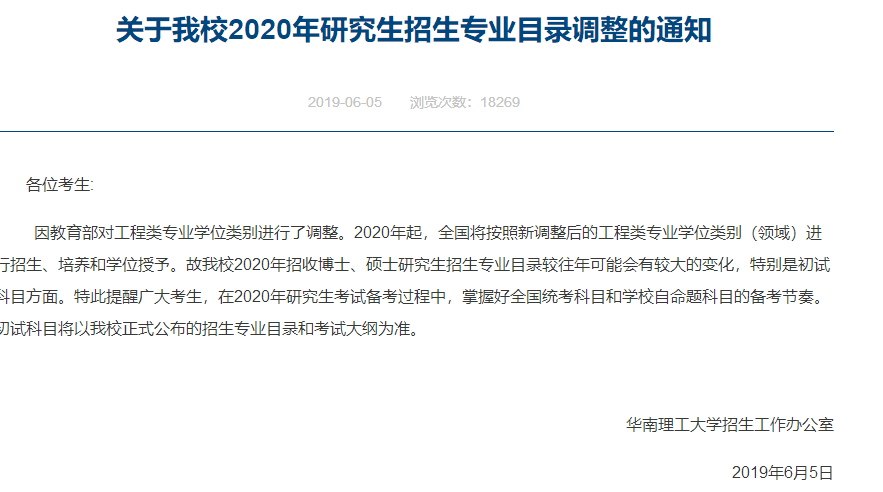 据聚创考研信息网得知!近期不仅官宣2020年考研大纲时间,多所院校专业也发布了招生专业目录变动通知!其中包括华南理工大学、湖南大学