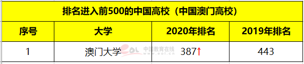 澳门地区有1所高校进入排名前500,其中,澳门大学进步显著,上升56名。
