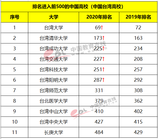 台湾地区共有11所高校进入排名前500,其中6所大学的排名有明显上升,5所下降。台湾排名最高的大学依旧为台湾大学,今年排名世界第69位。