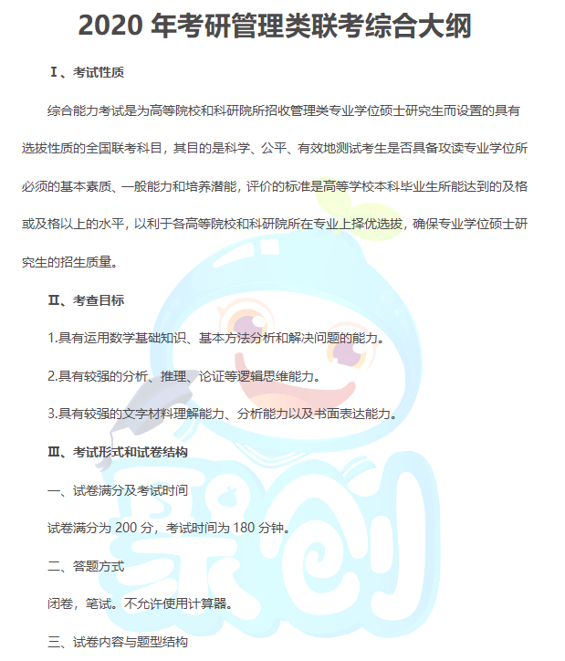 2020管理类专业学位联考综合能力考研大纲已发布,为方便大家备考,聚创考研信息网为大家整理如下: