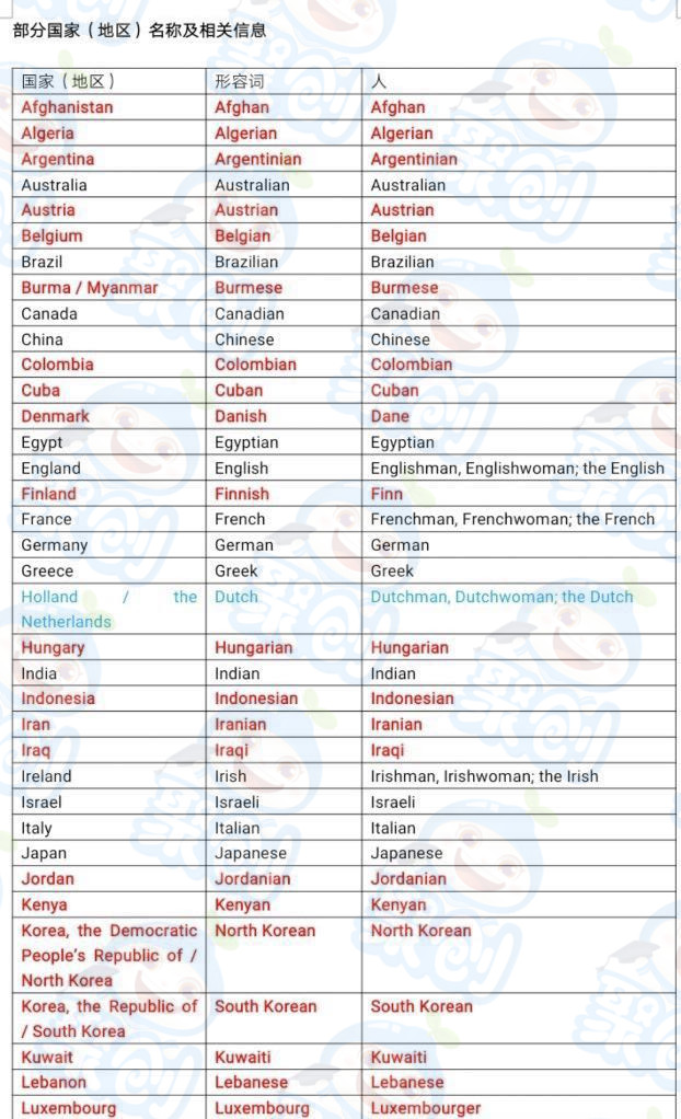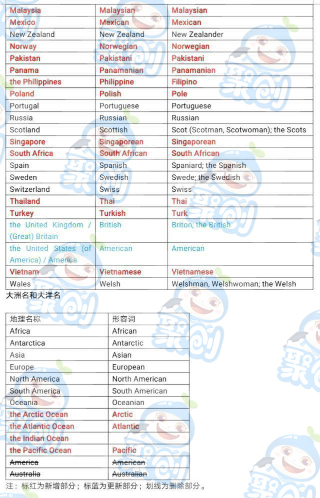 新增Afghanistan等33个国家名称(一带一路友好国),以及2019年考研英语二大纲只列举了七大洲的名称及形容词,此次2020年考研英语新大纲新增了四大洋的名称及形容词。