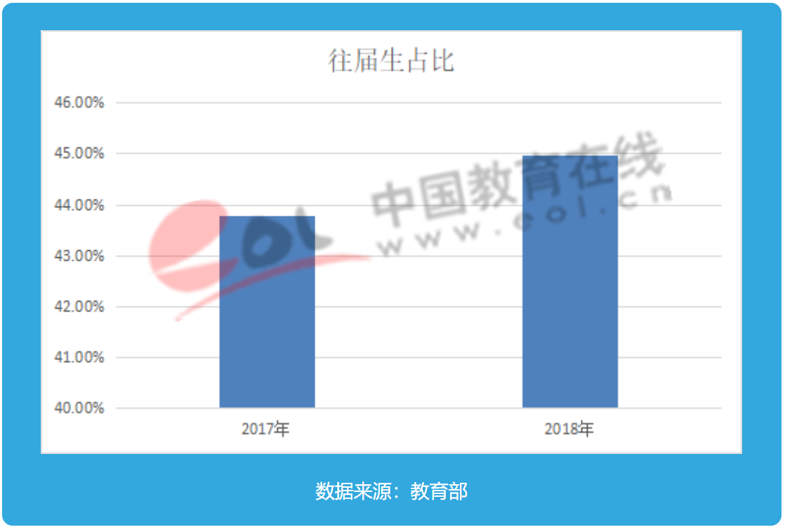 据教育部统计,2017年共201万人报考,其中,应届考生113万人,往届考生88万人;2018年共238万人报考,其中,应届考生131万人,往届考生107万人。从数据可知,2017年往届生考研人数占全国报考人数的43.8%,2018年往届生占比达到45%,接近半数,往届生占比进一步扩大。