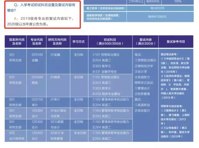 2020计划招生全日制45人(拟接收推免不超5人),学制2年,学费3.5万/年。住宿费1500元每年。附:奖助学金体系方案(仅非定向就业考生享受)复试内容包括政治、外语能力、综合能力面试和专业课笔试。复试笔试内容:政治+公司财务与会计(包括会计学与财务管理)复试笔试范围与参考书目:(1)政治:习近平新时代中国特色社会主义思想、党十九大的有关理论政策等;(2)石本仁,曾亚敏.《中级财务会计(微课版 第四版)》[M].中国工信出版集团,人民邮电出版社.2019年2月;(3)荆新,王化成,刘俊彦.《财务管理学》(第八版)[M].北京:中国人民大学出版社,2018年.复试时间:2020年3月-4月(具体时间届时公布)