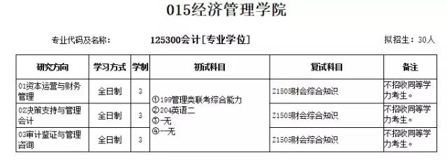 2020计划招生全日制会计硕士30人,学制3年。不招生同等学力考生。