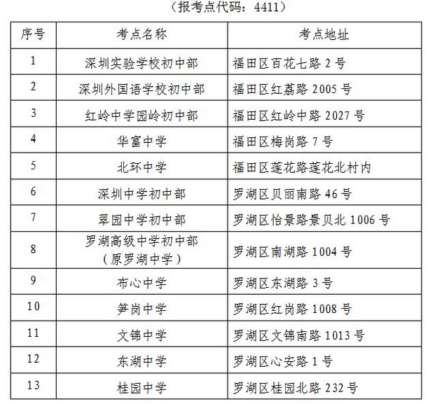 (三)在市招考办报名点(4411)报名考生的考点、考场和座位号已在深圳招考网上公布,请考生尽快查询。考前一天下午16:30—17:30,考生可到考点熟悉交通路线,查看考场情况。凡在深圳大学报名点报名(确认资格)的考生,考场由深圳大学安排。